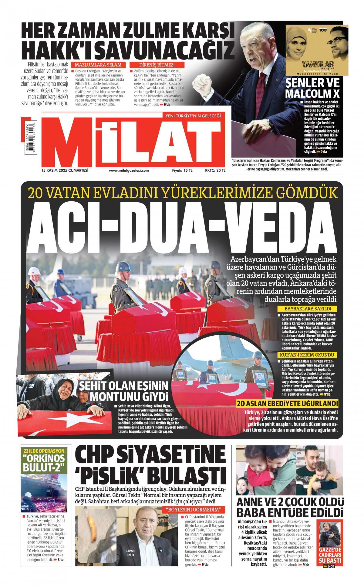 Milat Gazetesi 15 Kasım 2025 Günü Manşeti