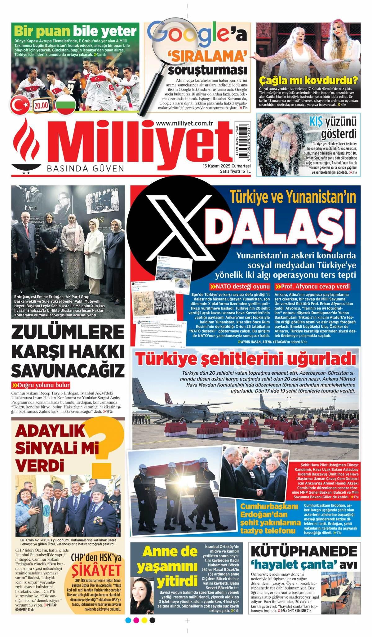 Milliyet Gazetesi 15 Kasım 2025 Günü Manşeti