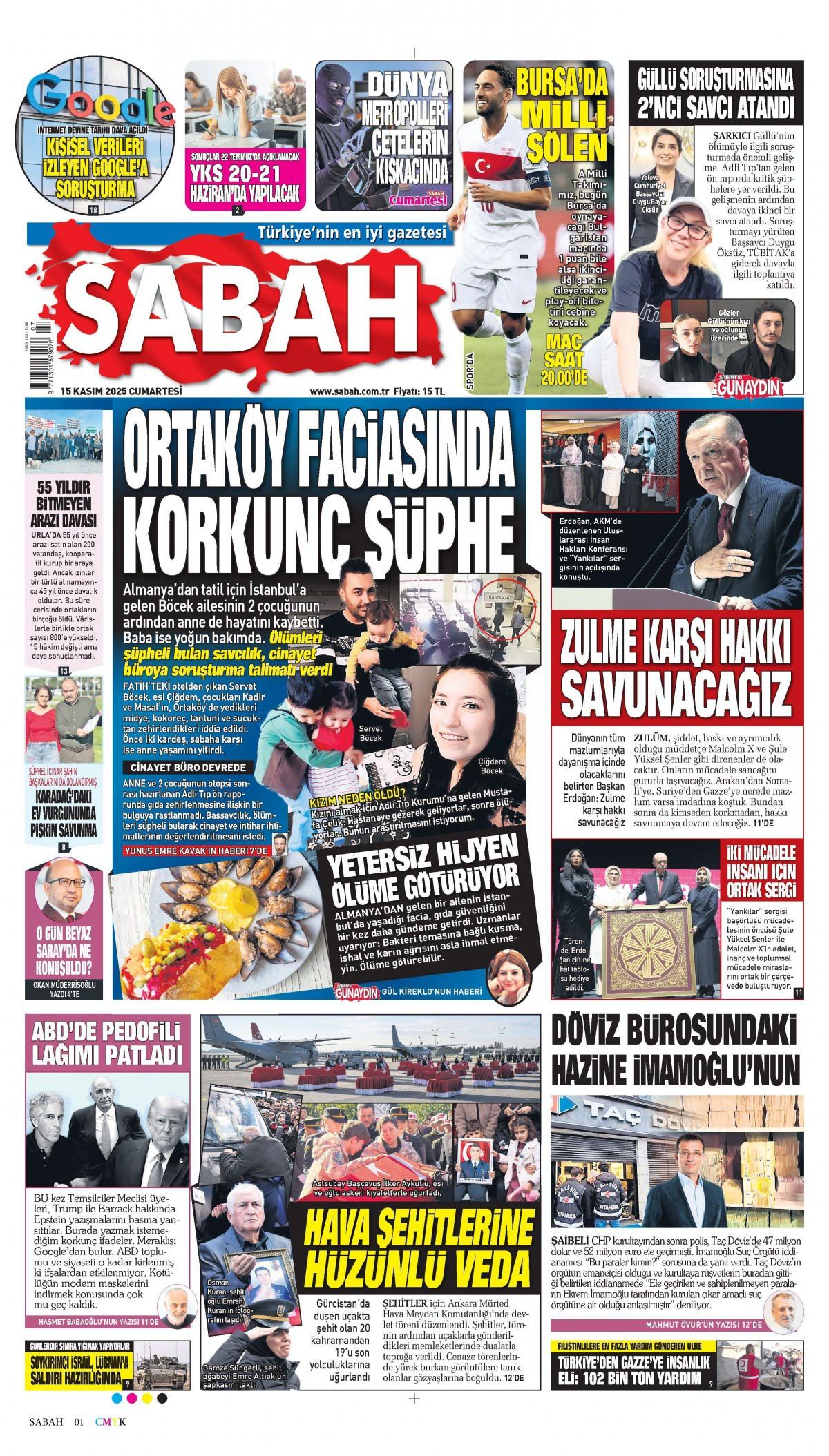 Sabah Gazetesi 15 Kasım 2025 Günü Manşeti